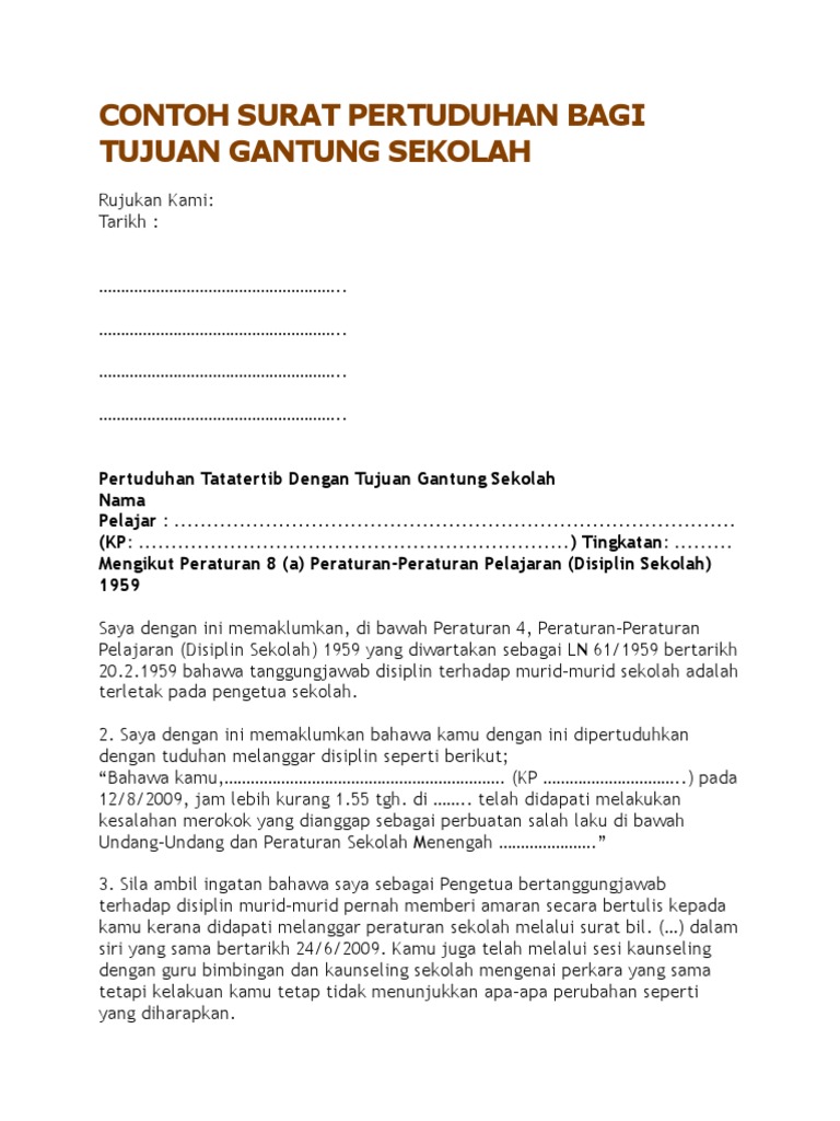 Contoh surat pertuduhan dengan tujuan buang sekolah sebagai hukuman. Surat Gantung Sekolah. Tuan Undang-Undang Pelancongan Sekolah 1957 Surat Kebenaran Daripada Ibu Bapa Dengan segala hormatnya perkara di atas dirujuki.