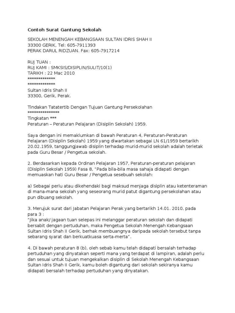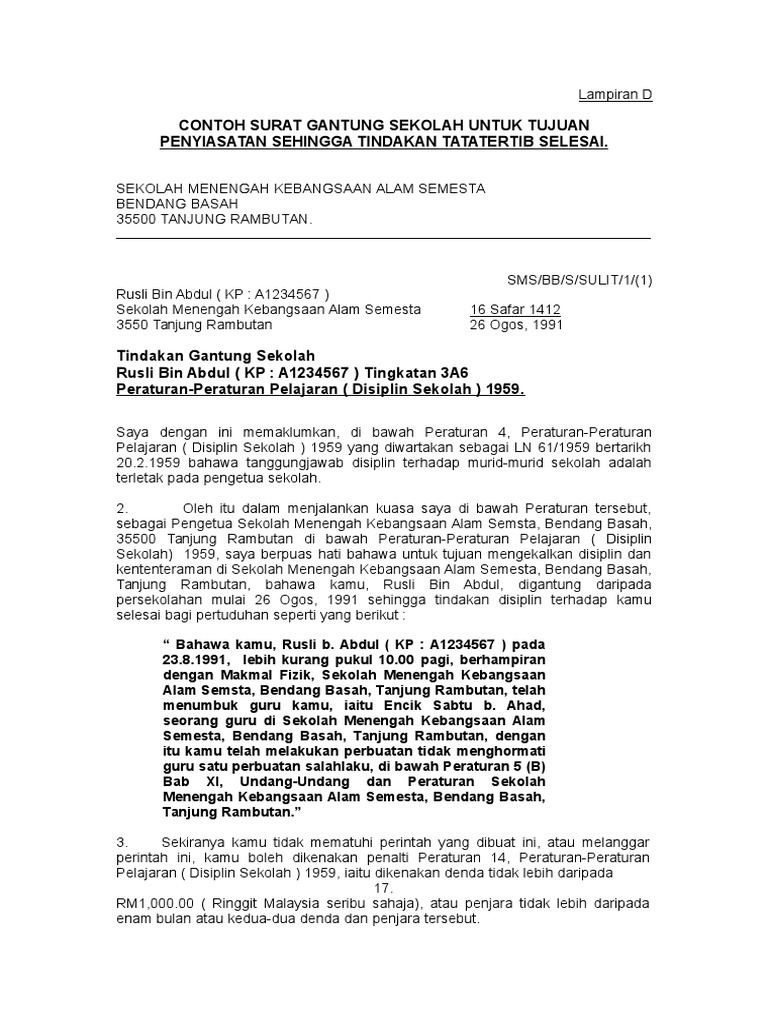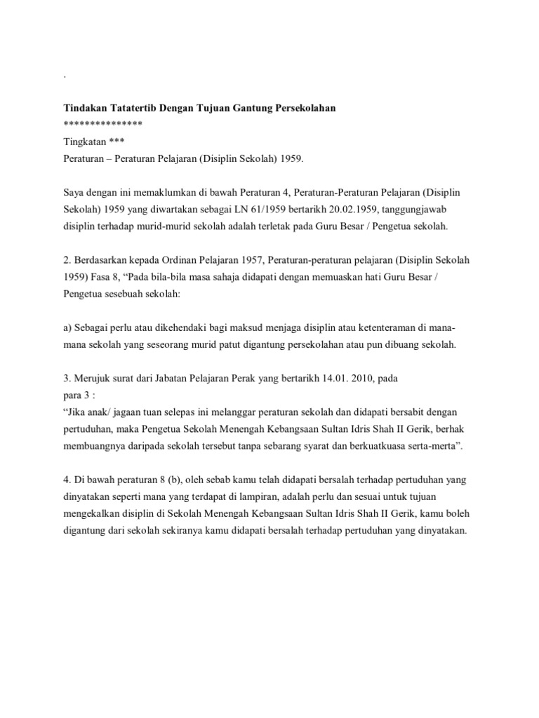 Contoh surat gantung sekolah untuk tujuan penyiasatan sehingga tindakan disiplin selesai. Prosedur Gantung Dan Buang Sekolah Mengikut Peraturan 4 Dan 8 Peratur. Contoh Surat Rasmi Rayuan Pertukaran Universiti Contoh Two.