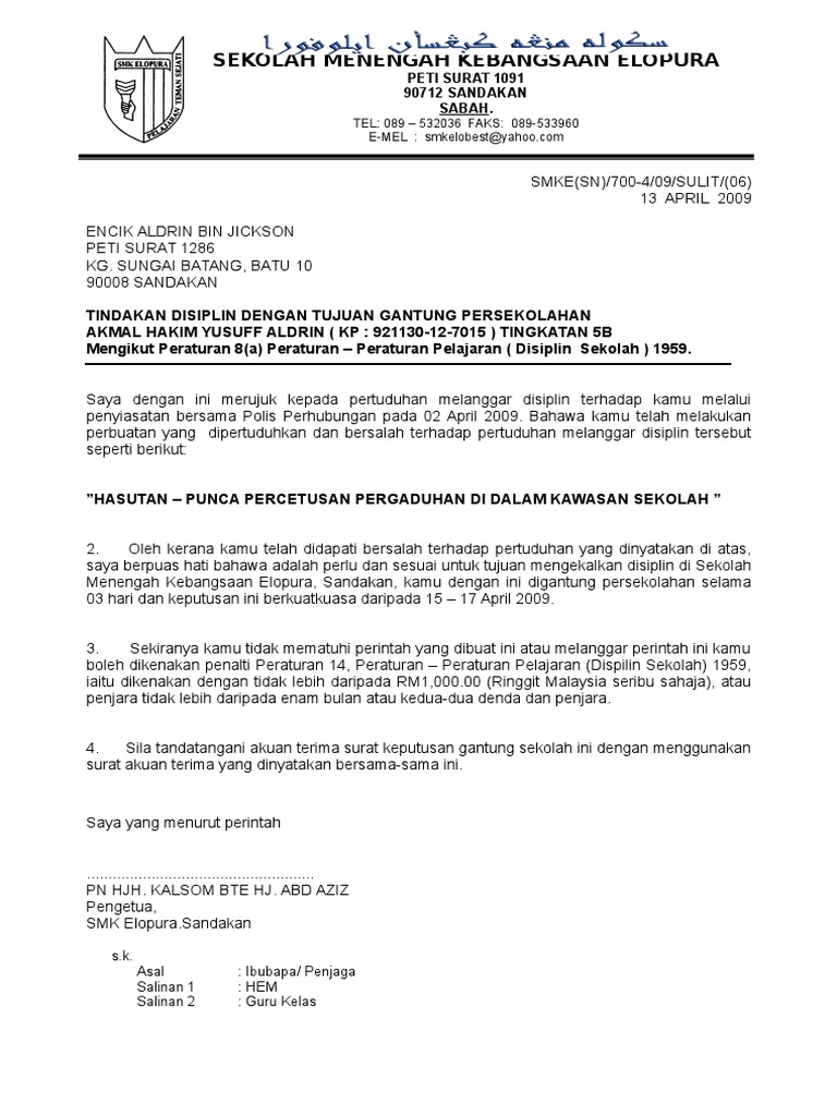 A Sebagai perlu atau dikehendaki bagi maksud menjaga disiplin atau ketenteraman di mana-mana sekolah yang seseorang murid patut digantung persekolahan atau pun dibuang sekolah. 61 Surat Pekeliling Ikhtisas Kementerian Pendidikan Bil. Berikut ini adalah kode administrasi dalam surat menyurat yang merupakan kumpulan file dari berbagi sumber administrasi tentang contoh surat gantung sekolah yang bisa bapak ibu gunakan dan diunduh secara gratis dengan.