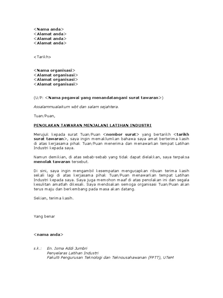 Ikut contoh surat tolak tawaran untuk latihan industri internship atau praktikal. Buat surat penolakan yang sopan dengan singkat dan langsung pada pokok. Surat rasmi tolak tawaran 12 descargar.